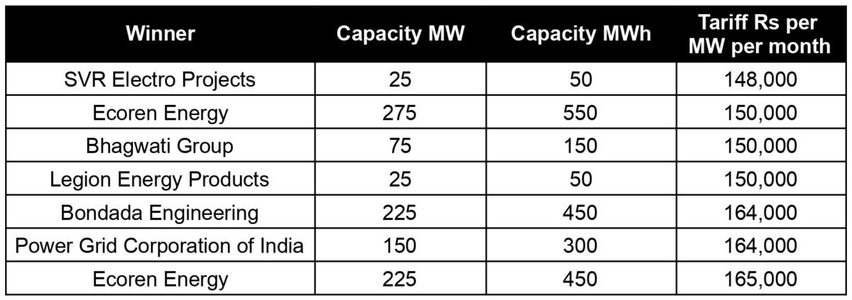 SVR Electro Projects secured 25 MW and 50 MWh at a tariff of Rs 148,000 per MW per month. Ecoren Energy won 275 MW and 550 MWh, Bhagwati Group took 75 MW and 150 MWh, and Legion Energy Products received 25 MW and 50 MWh. These bidders quoted tariffs of Rs 150,000 per MW per month. Bondada Engineering won 225 MW and 450 MWh, and Power Grid Corporation of India secured 150 MW and 300 MWh, both at Rs 164,000 per MW per month. Ecoren Energy also added 225 MW and 450 MWh at Rs 165,000 per MW per month.