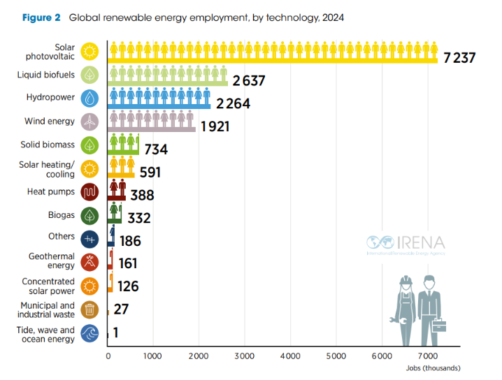 Global renewable energy employment by technology in 2024, with solar photovoltaic leading job creation followed by biofuels, hydropower and wind. Source: IRENA, Renewable energy and jobs: Annual review 2025.