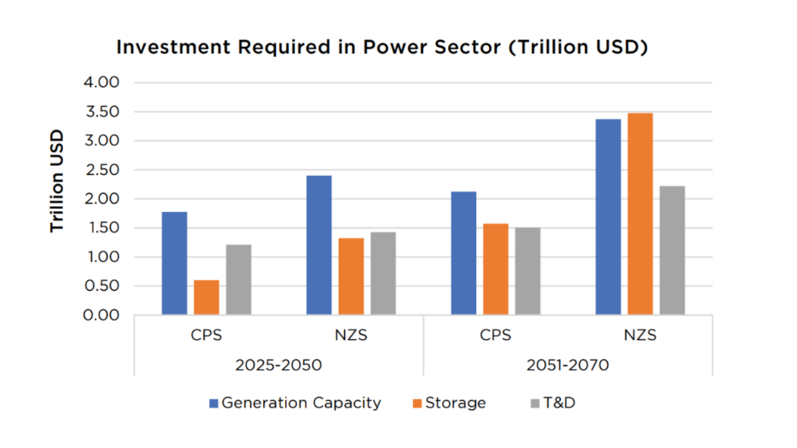 Cumulative investment requirements between 2025 and 2070 are estimated at $8.79 trillion under the current policy scenario and $14.23 trillion under the net-zero scenario. Of the net-zero total, around 74% is allocated to generation and storage capacity expansion, while 26% is required for transmission and distribution infrastructure.